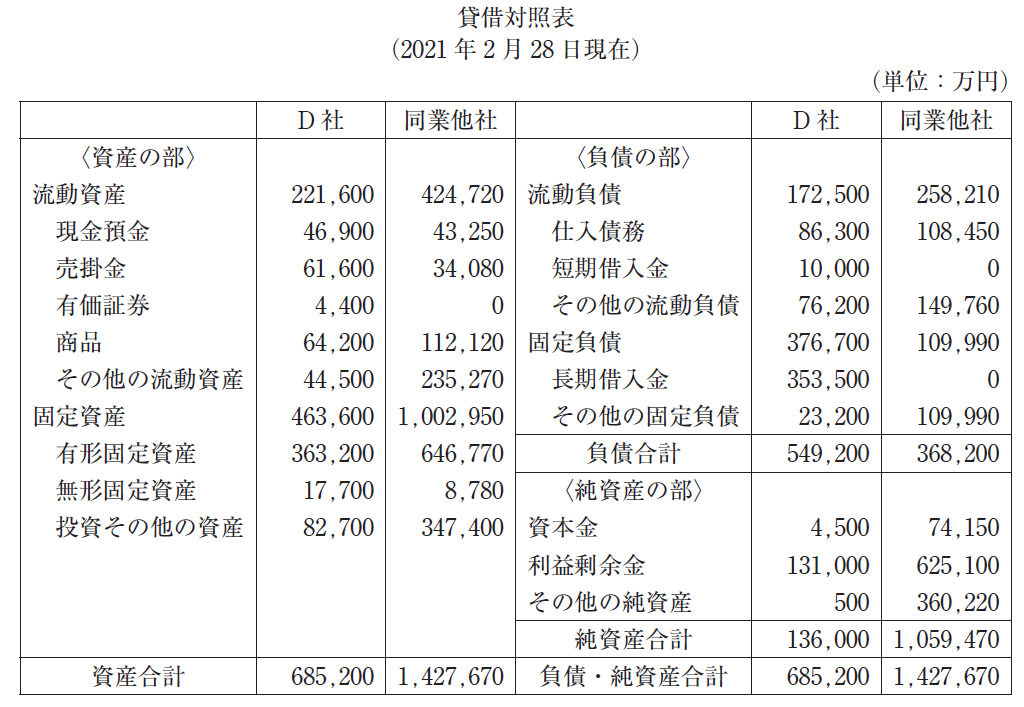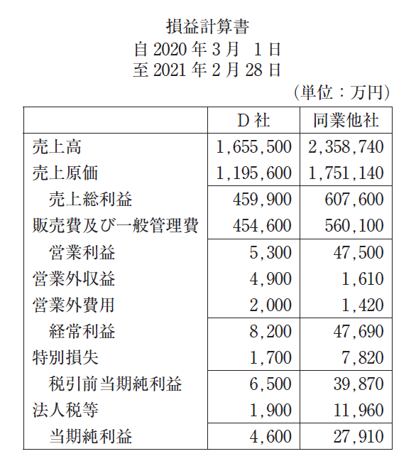 D社と同業他社の2020年度の財務諸表は以下のとおりである。